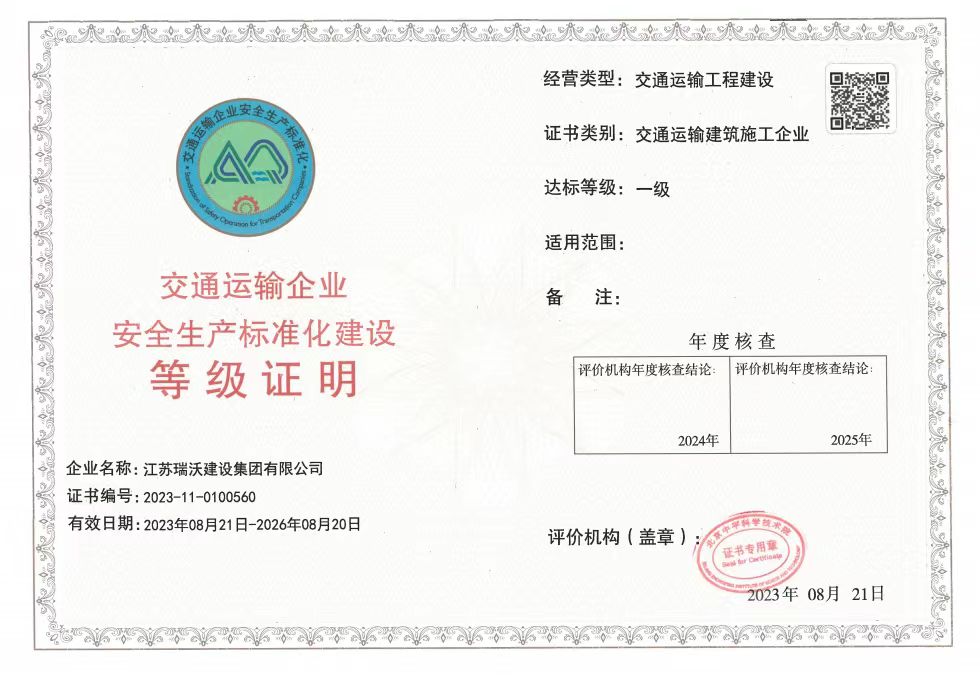 江蘇瑞沃建設集團有限公司成立于2007年,是一家以市政、交通工程建設為主導,集房屋建筑、交通安全設施、城市道路照明工程、電力工程、隧道工程、航道工程及投融資為一體的綜合性企業(yè)。企業(yè)注冊資本60000萬元,現(xiàn)有各類技術人員580人,其中中、高級以上人員498人,注冊類人員268人,一、二級建造師166人。公司榮獲“江蘇省建筑業(yè)優(yōu)秀企業(yè)”、“江蘇省五一勞動獎狀”,連續(xù)多年被評為“揚州市先進企業(yè)”、“江蘇省建筑業(yè)百強企業(yè)”,連續(xù)八年蟬聯(lián)百強企業(yè)基礎設施類第一名。